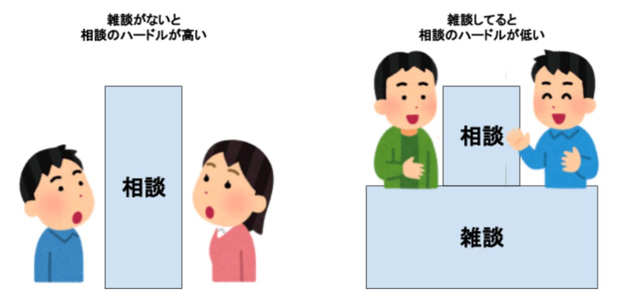 それに、普段から雑談さえしていない関係で、急に相談するとなると心理的なハードルがとても高くなります。雑談できる関係性があるからこそ、いつでも相談できるようになるわけです。