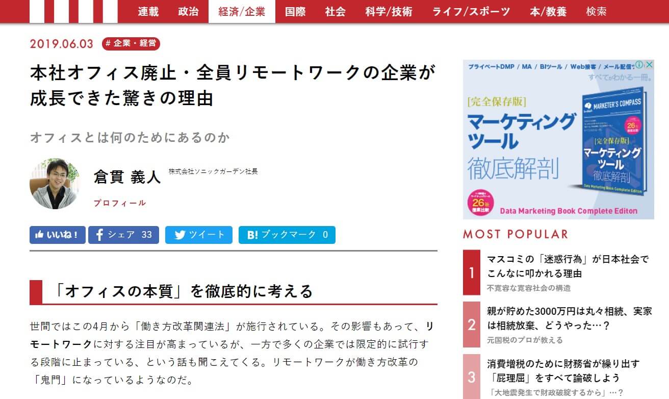 講談社のオンラインメディア 「現代ビジネス」に『本社オフィス廃止・全員リモートワークの企業が成長できた驚きの理由 』というテーマで寄稿しました。